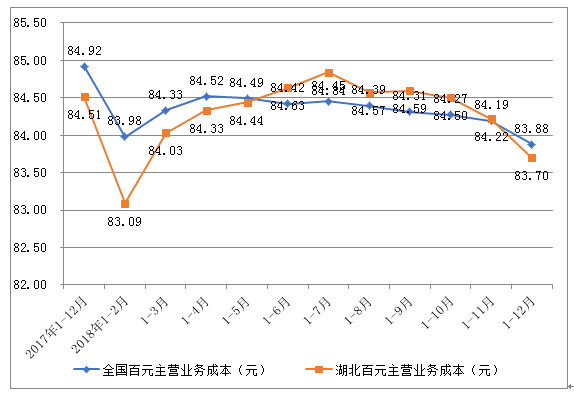 图4 全国和湖北各月累计每百元主营业务收入中的成本