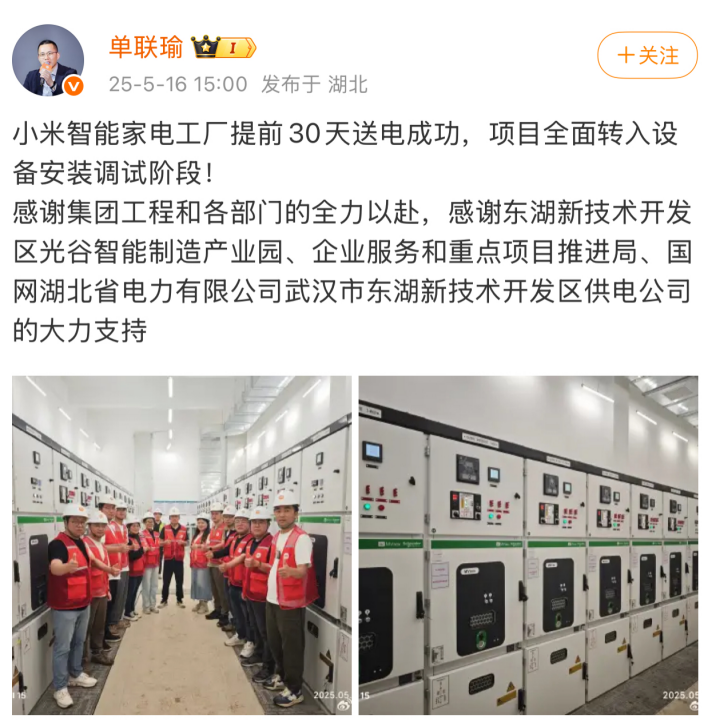 以小米智能家电工厂项目为例,2024年8月,项目签约落户武汉,当年11月26日就奠基开工,2025年1月20日就完成了结构性封顶。从签约到开工,3个月;从开工到封顶,2个月。几天前,工厂提前一个月送电成功,小米集团大家电部总经理单联瑜发微博致谢。