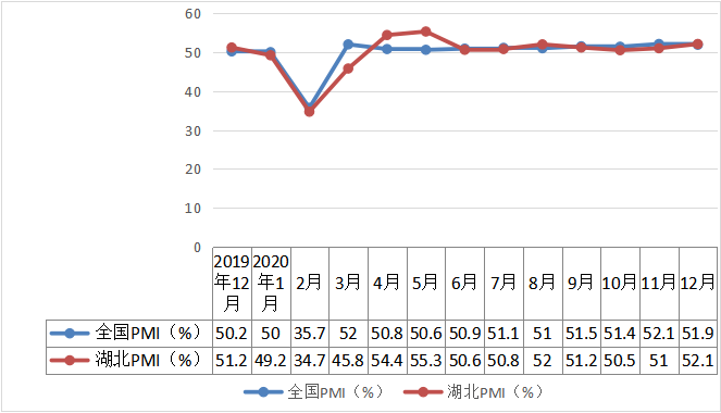 先行指标明显好转。从用电量看,2020年,全省工业用电1269.8亿千瓦,下降3.4%,降幅较前三季度(-8.3%)收窄4.9个百分点。从PMI看,12月份,湖北制造业采购经理指数(PMI)为52.1%,较上月上升1.1个百分点,连续9个月位于临界点以上,制造业市场活力进一步增强。从货运量看,2020年,全省铁路货运量4611.5万吨,下降5.1%,降幅较前三季度(-7.25%)收窄2.15个百分点。