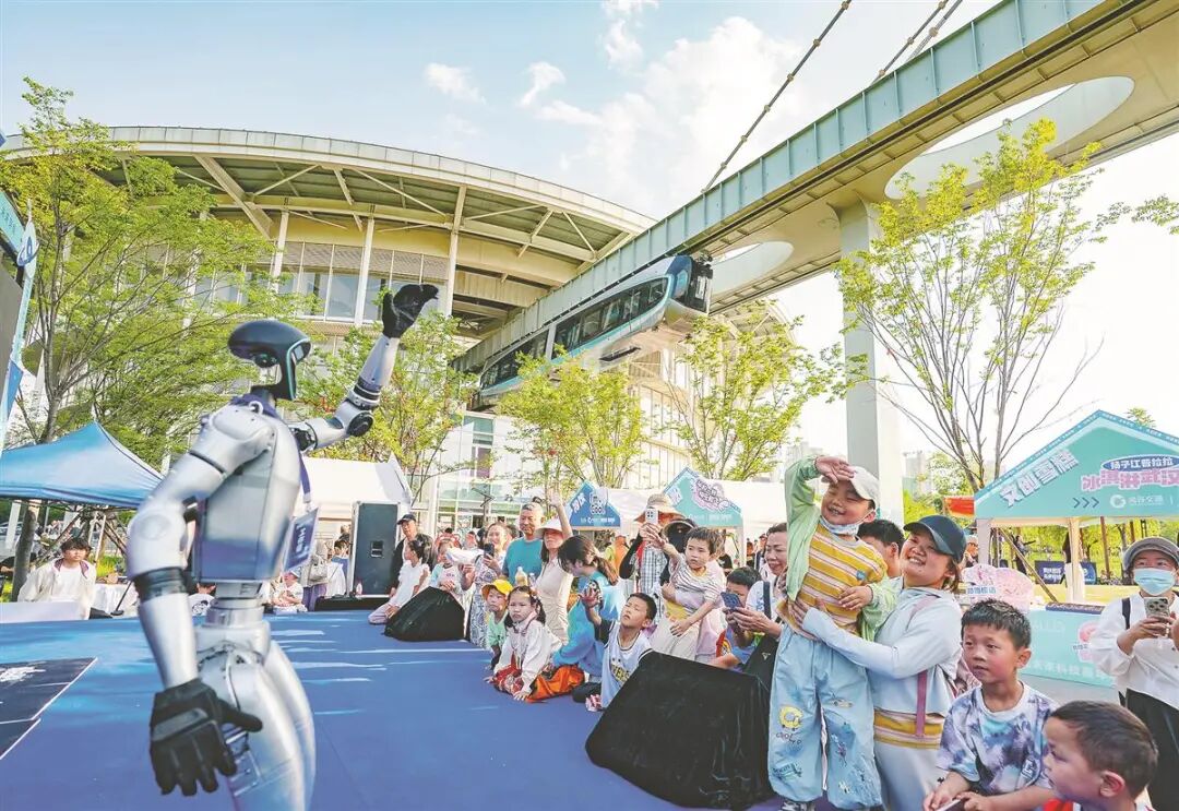 2025年5月1日,在武汉光谷空轨高新大道站,人形机器人与游客互动。