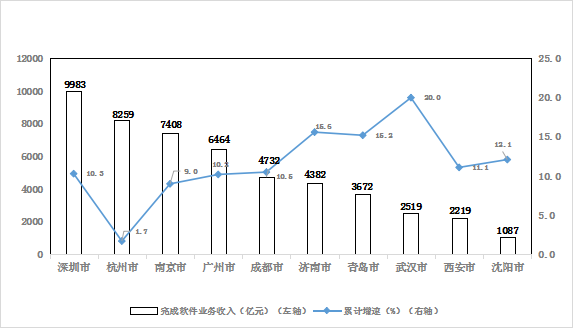作为中国软件特色名城,武汉市在全国15个副省级中心城市中产业规模由2021年第9位升至第8,在前十位副省级中心城市同比增速排名第一。