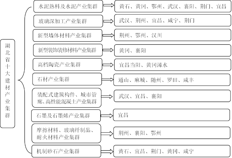 “十三五”期间,全省水泥企业积极向产业链上下游延伸,多家水泥企业布局预拌混凝土产业,水泥龙头企业均已进入砂石骨料行业,石材产业已形成包括矿产勘查、矿山开采、石材加工、物流商贸、配套服务等各环节在内的完整产业体系。截至2020年底,建材行业共有10个集群列入省政府重点成长型产业集群。全省已经形成麻城、随县等六大石材产业聚集区和中部(麻城)石材循环经济产业园、吴山镇闽商石材工业园等六个产业园区的布局。至“十三五”末,规模排名前四的水泥熟料企业产能占全省产能的70%;规模排名前四的玻璃企业的平板玻璃产能约占全省产能的90%。